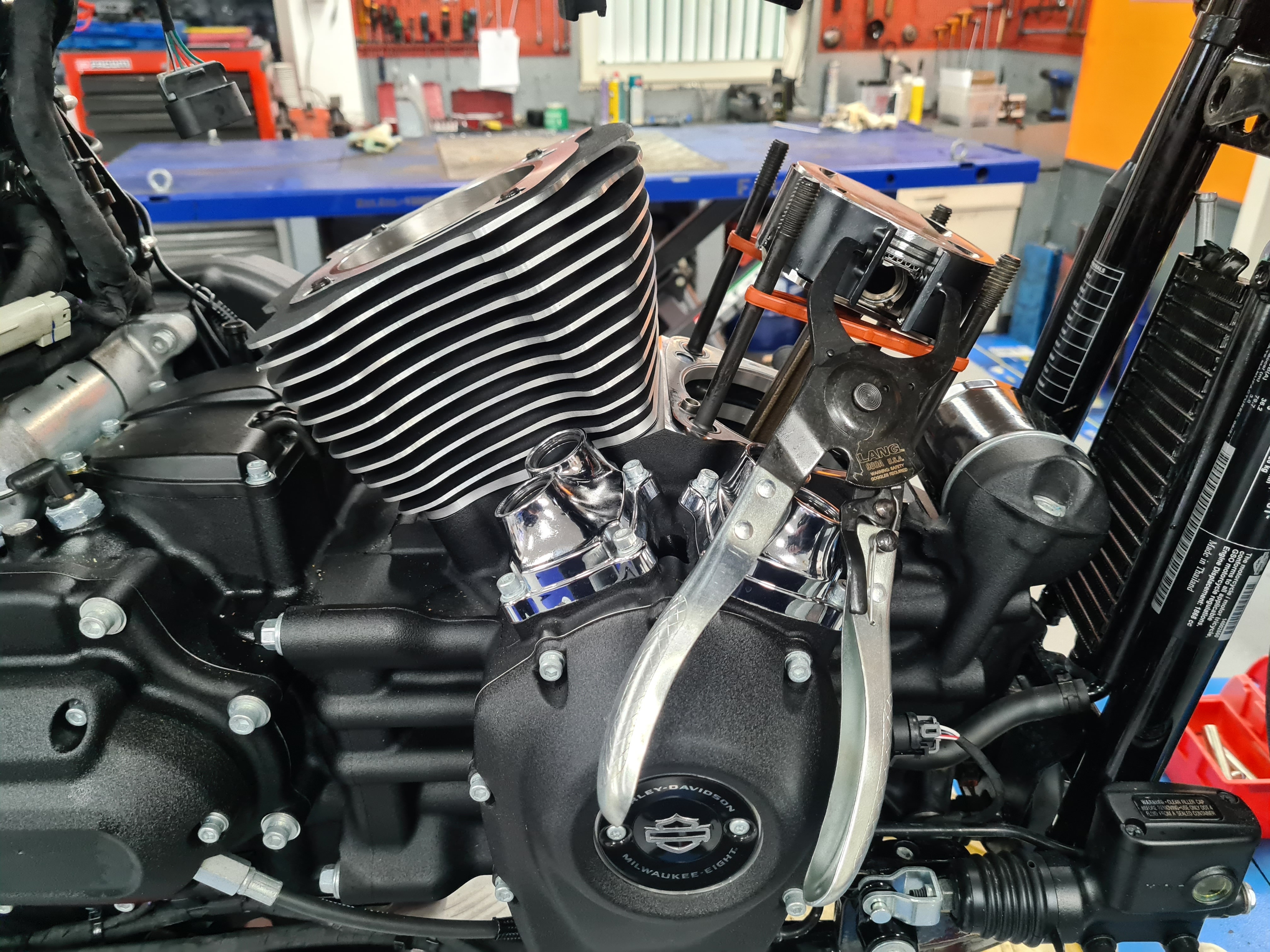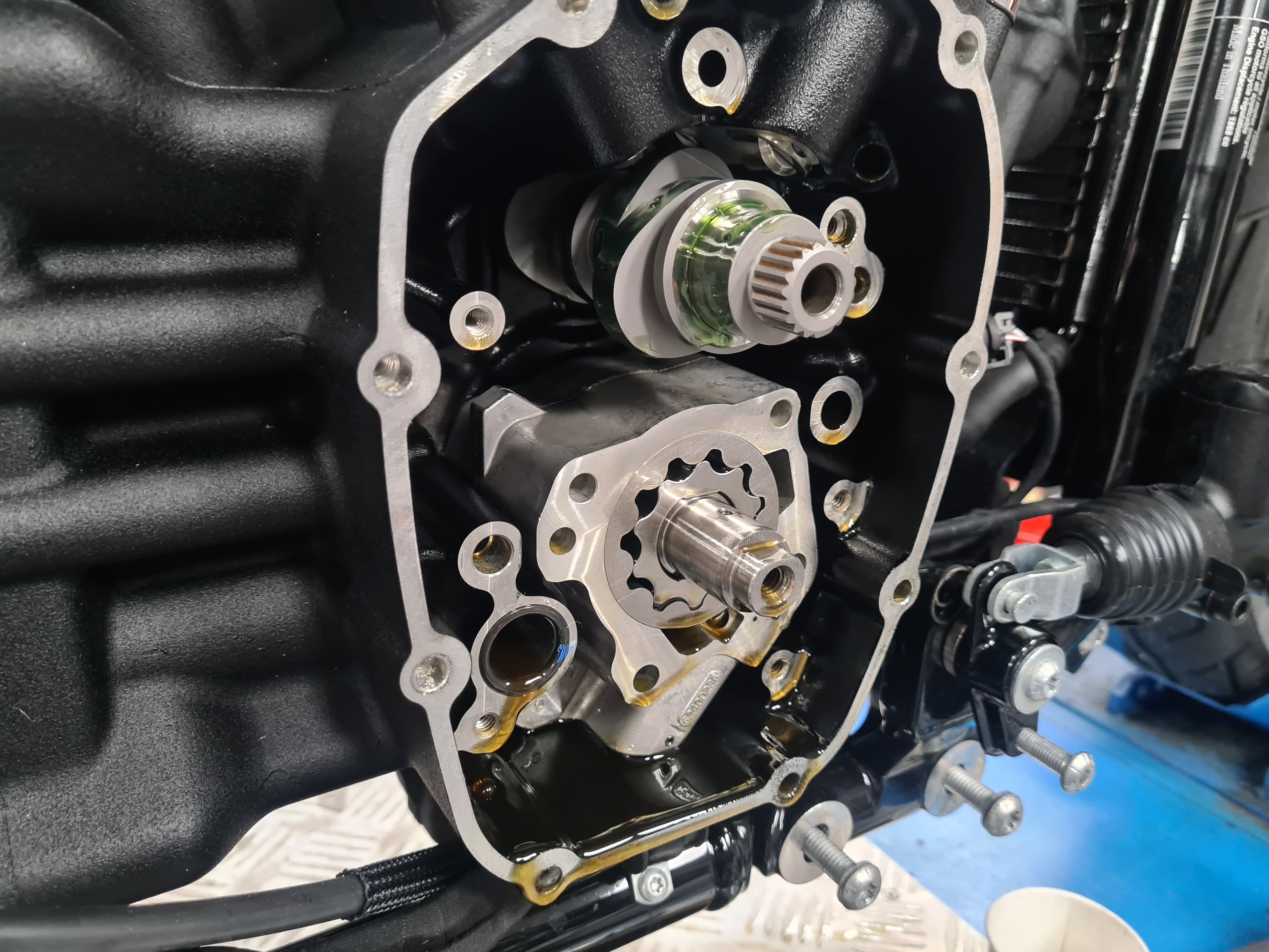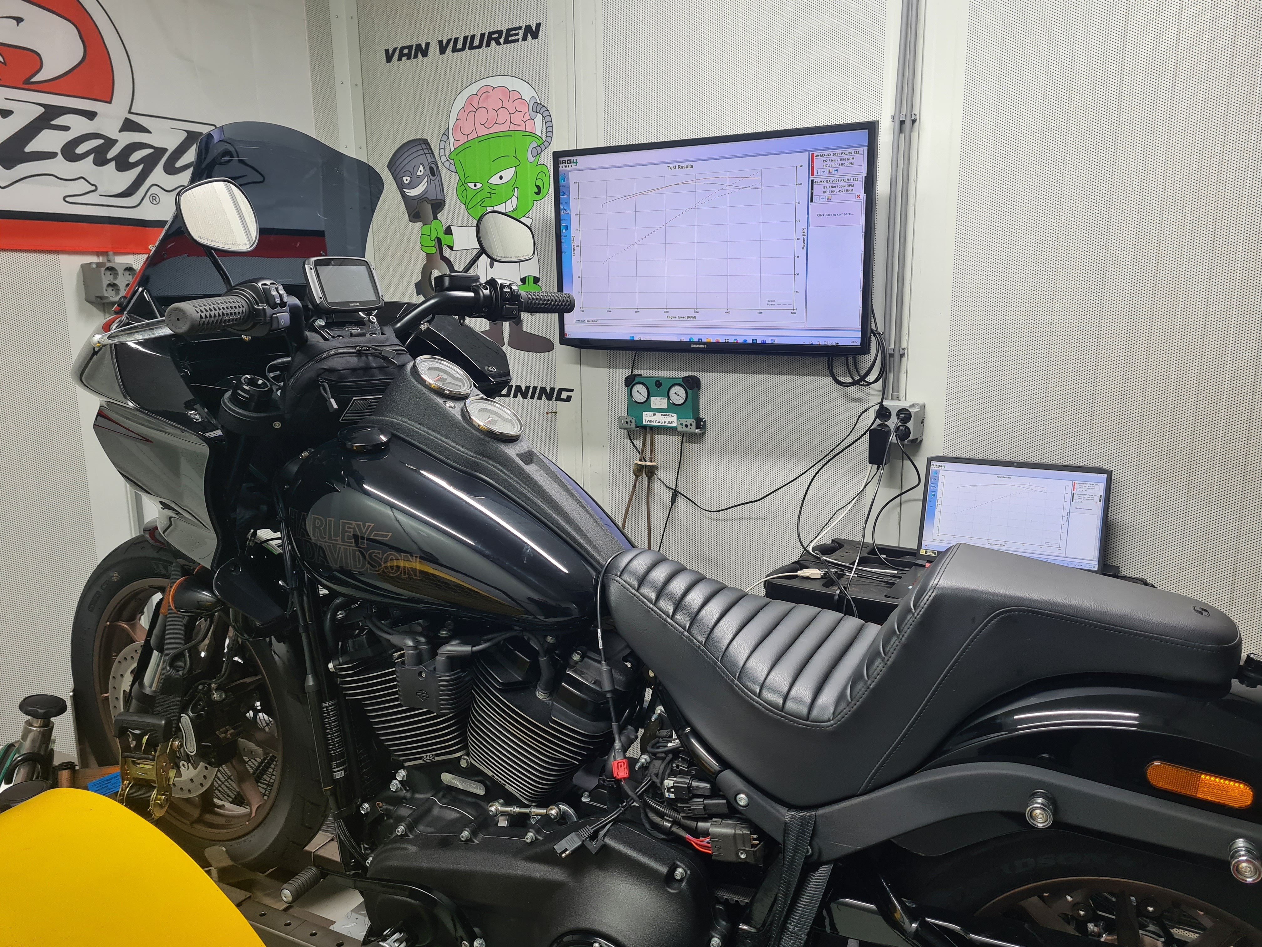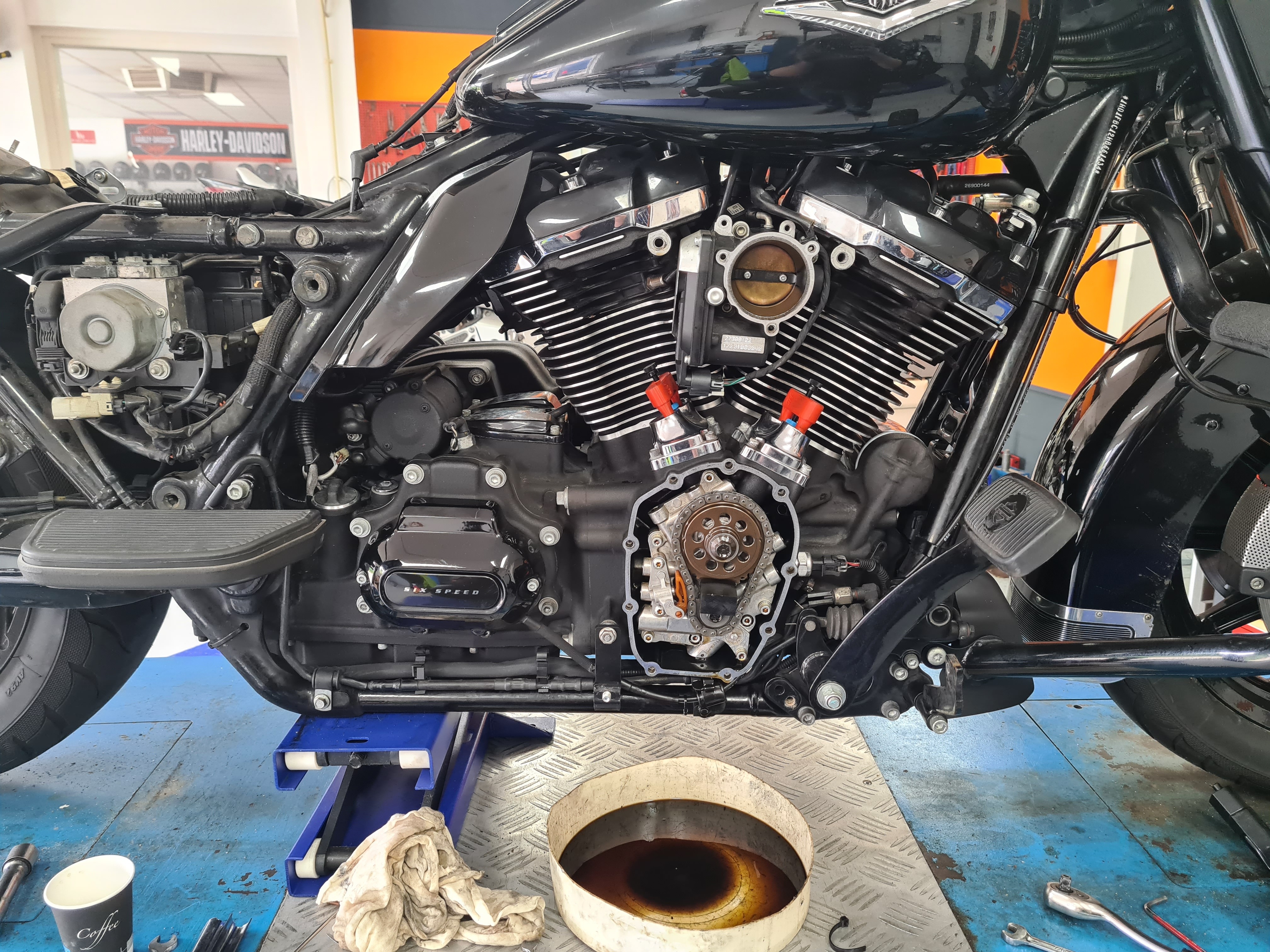 Deze motor hebben we voorzien van de volgende onderdelen S&S 129 inch Big Bore kit, Feuling camplate oliepomp en lifters, S&S stelbare stoterstangen, Screamin Eagle CNC koppen met S&S top end guardian kit en kop bouten, S&S 540 Torque cam, 64 MM gasklephuis, 6,3 gram injectoren en S&S Tappet cufs. Dit alls is uitgemond in een super dikke toer motor met een berg koppel over heel het toeren gebied. En evengoed nog een flink aantal PK's